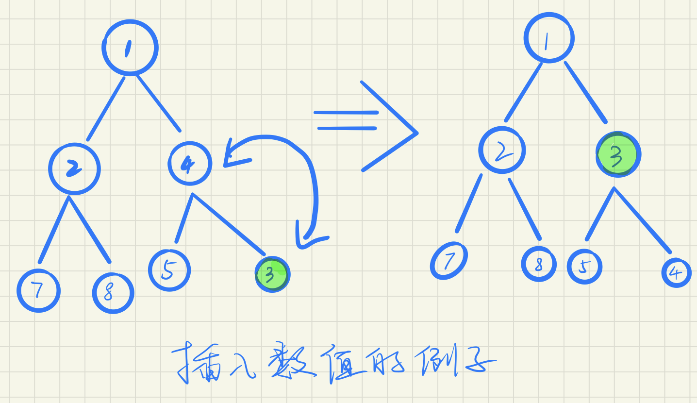 交换直到没有大小颠倒为止。在向下交换的过程中,如果有两个儿子,那么选择数值较小的儿子(如果儿子比自己小的话)进行交换。
